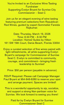 This elegant evening of wine tasting is a fundraiser for Evelyn Bryant, who is running for Sunrise City Commissioner – Seat C. Wines will be provided by Republican Red Wines, accompanied by light refreshments. Admission is $50, payable in advance. An RSVP is required. To RSVP call Paul Bryant at (954) 646-6280. Space is limited, so reserve your spot today.