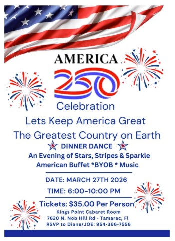 Join fellow patriots as they celebrate America’s 250th Anniversary with an evening of stars, stripes and sparkle. Tickets are $35 and include an American buffet and music. Feel free to bring your own cocktails! Please RSVP to Diane & Joe at (954) 366-7556.
