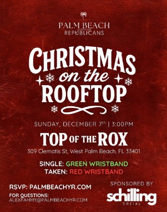 Join the Palm Beach Young Republicans for Christmas on the Rooftop. Singles will wear green wristbands and couples will wear red wristbands at this fun social event. Admission is $10 for members and $20 for non-members. Get tickets at https://www.palmbeachyr.com/event-details/christmas-on-the-rooftop. For more information contact Alex Fahmy at AlexFahmy@PalmBeachYR.com.