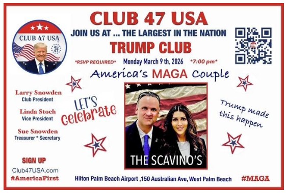 Club 47 never disappoints! This month Club 47 presents Dan & Erin Scavino. A ticket is required and must be purchased in advance. Get tickets at https://www.eventbrite.com/e/club-47-usa-march-9-meeting-with-dan-scavino-tickets-1983830698021?aff=oddtdtcreator.