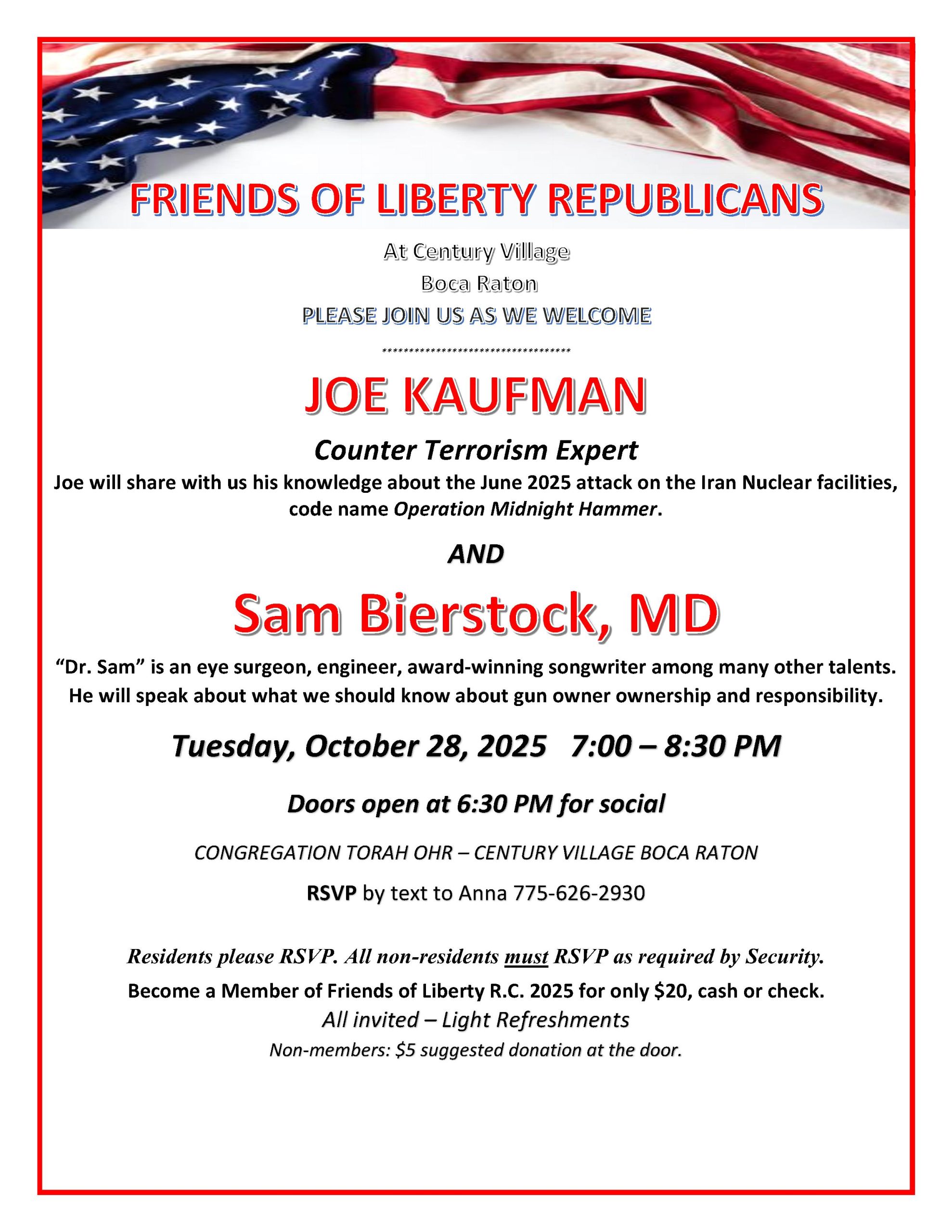 This month’s speakers are Joe Kaufman, Counter Terrorism expert, and Dr. Sam Bierstock, eye surgeon, songwriter, electrical engineer and recipient of the George Washington Medal from the Freedom Foundation. Joe will talk about the 2025 attack on the Iran nuclear facilities, code name Operation Midnight Hammer. Sam will talk about what we should know about gun ownership and responsibility.