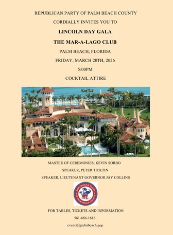 The Republican Party of Palm Beach County’s Lincoln Day Gala is largest annual fundraiser of the year. This years Master of Ceremonies is Kevin Sorbo. Featured speakers include Peter Ticktin and Lieutenant Governor Jay Collins. More speakers will be announced soon. For tables, tickets, sponsorship and more information, call (561) 686-1616 or email events@palmbeach.gop. Check back for more details.