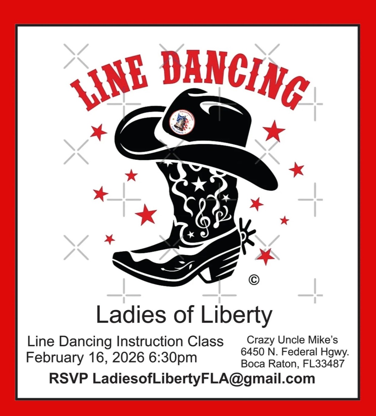 Join the Federated Republican Ladies of Liberty for a fun night of line dancing. This is a free social event. You just pay for whatever you order to eat or drink. There will be line dancing lessons at 6:30pm. Come anytime after that to join in the fun!