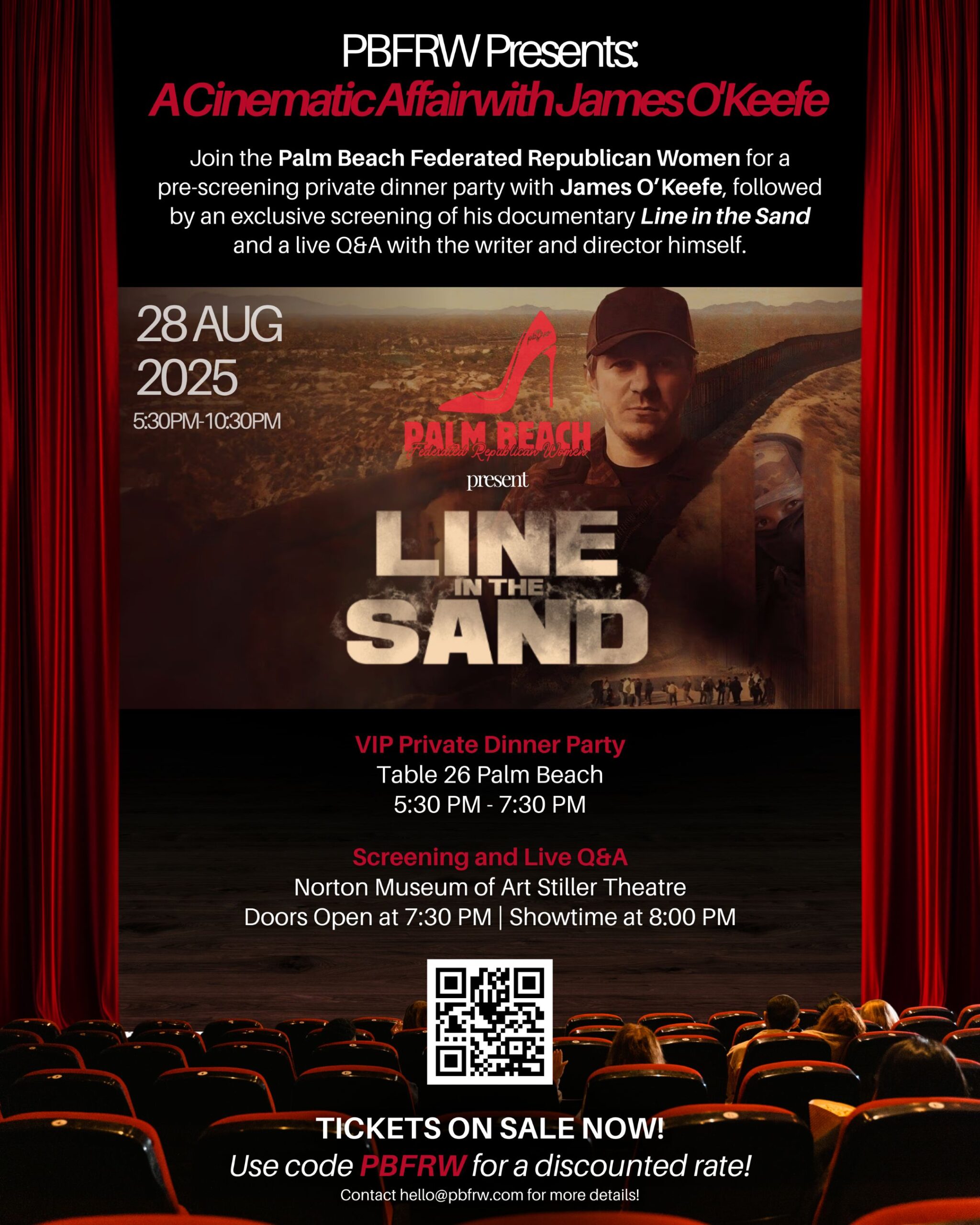 Step into Palm Beach elegance at the James O’Keefe’s Line in the Sand pre-screening VIP dinner party, hosted at the iconic Table 26 Palm Beach. Mingle with fellow Palm Beach Federated Republican Women and distinguished guests over crafted cocktails and a chef-curated dinner. Photo opportunities with James O’Keefe included. There will be a private movie screening at 8pm (please arrive by 7:45pm) at the Norton Museum, and will include a Q&A with James O’Keefe afterwards. It is a short walk from one venue to the other.