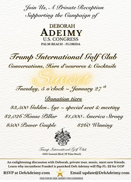 This is a private reception supporting the campaign of Deborah Adeimy, who is running for Congress in District 22. To RSVP go to http://DebAdeimy.com.