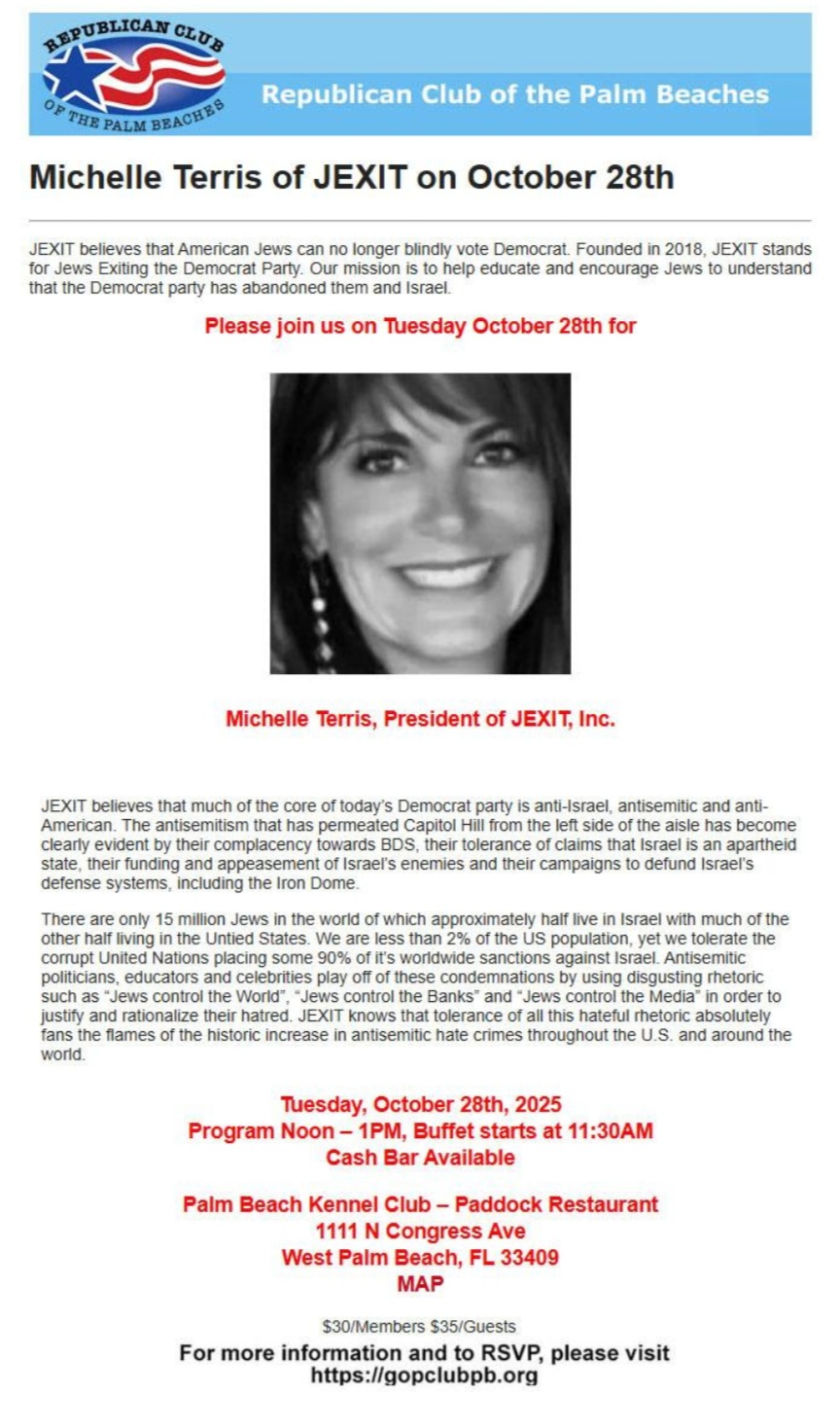 The program is 12pm noon – 1pm, the buffet starts at 11:30am. Food is included and there will be a cash bar. Admission is $30 for members and $35 for guests, paid at the door. You must RSVP in advance. To RSVP visit https://gopclubpb.org/events-2/event-rsvp/?cmd=form&eid=7441, call (561) 855-0749 or email info@gopclubpb.org.