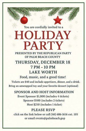 Join the Republican Party of Palm Beach County at this special holiday party! Enjoy food, music and a great time with your fellow Republican Executive (REC) members and other like-minded friends. The party is in downtown Lake Worth, but you must purchase a ticket to obtain the exact location. Bring an unwrapped toy for our Toy Drive and, optionally, your favorite desert to share. Tickets are $40 and include appetizers, dinner and a drink. If you would like to be a sponsor, please call (561) 686-1616 extension 105 or email events@palmbeach.gop. Sponsor and host opportunities include Event Sponsor for $1000 (includes 4 tickets), Sponsor for $500 (includes 2 tickets) and Host for $250 (includes 1 ticket). Get your ticket at https://www.eventbrite.com/e/republican-party-of-palm-beach-county-holiday-party-tickets-1971883125510.