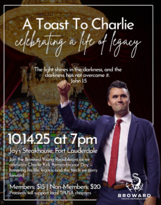 Join the Broward Young Republicans in a Toast to Charlie Kirk. Admission is $15 for members and $20 for non-members. Proceeds will support local TPUSA chapters. For more information or to RSVP, call (954) 300-3688 or email info@browardyrc.com.