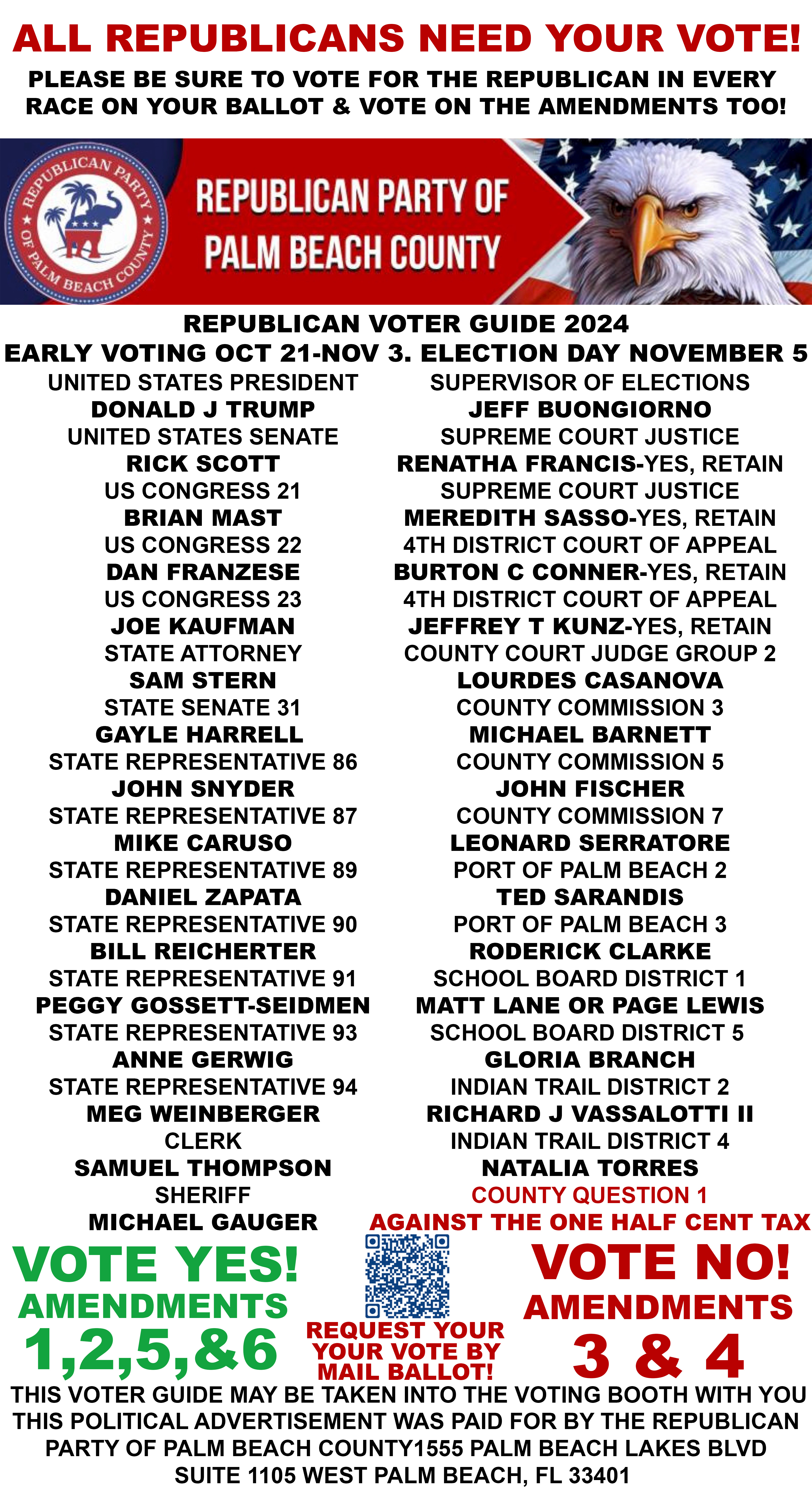 Some of these candidates will be on your ballot and some of them won’t be, because ballots vary by district. Your Voter ID Card will show which districts you are in, so you’ll know which candidates represent you. (If you email me your name and street address, I’ll look it up for you anywhere in Palm Beach County.) You can volunteer for candidates outside of your district. Every single one of these candidates can use more volunteers, donations, and your vote! We NEED you to vote for EVERY Republican on your ballot, all the way down to the end! This list is in the order they appear on the ballots.
